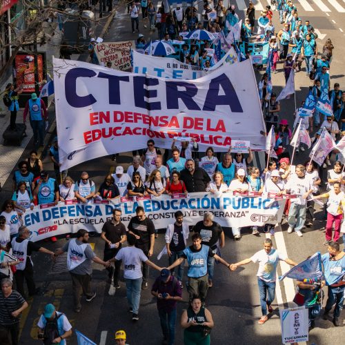 La Confédération des Travailleurs de l’Éducation de la République Argentine (CTERA) a organisé en septembre et en octobre une grande marche nationale pour la défense de l’école publique. Six caravanes composées d’enseignant·es de tous les niveaux se sont élancées de régions différentes pour converger le 14 octobre vers Buenos Aires et la Place de Mai, le Congrès national et le Secrétariat d’État à l’Éducation (Milei a supprimé le Ministère). Cette démonstration de force, relayée dans les médias et réalisée avec le soutien financier du programme de coopération syndicale internationale du SNES-FSU, a été un grand succès. Chaque étape de cette grande caravane a été l’occasion d’organiser des heures d’information syndicales, des distributions de tract et des événements culturels pour mobiliser les collègues et sensibiliser la population à l’importance de la défense de l’école publique. Elle a contribué à mettre la question des services publics et notamment du service public d’éducation dans la campagne législative de mi-mandat. Le SNES-FSU continuera de soutenir les camarades de la CTERA dans leur lutte contre les projets d’extrême-droite de Javier Milei.